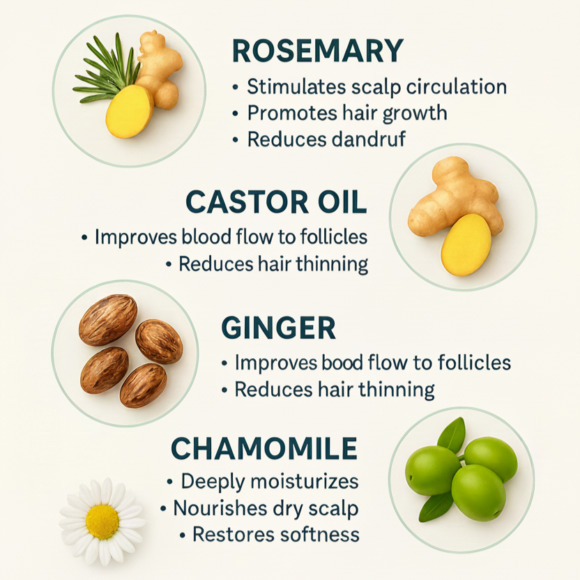 Answer 1: The oil contains a concentrated blend of rosemary, castor, ginger, olive, and chamomile oils. Rosemary promotes hair growth and reduces baldness, castor oil helps strengthen hair and adds shine, ginger has anti-inflammatory properties that can improve scalp health, olive oil nourishes and moisturizes hair, and chamomile soothes the scalp and enhances hair texture.