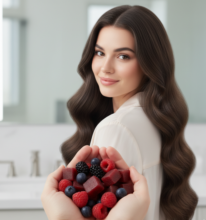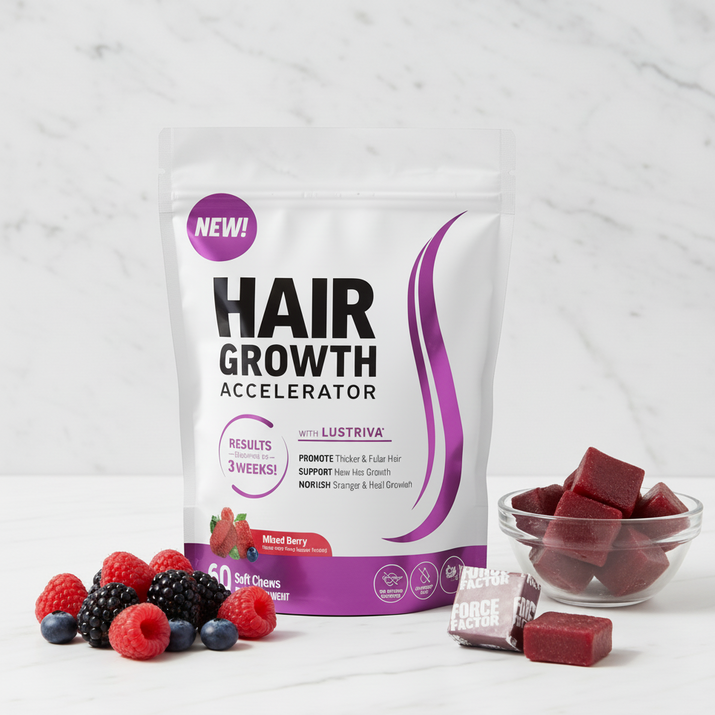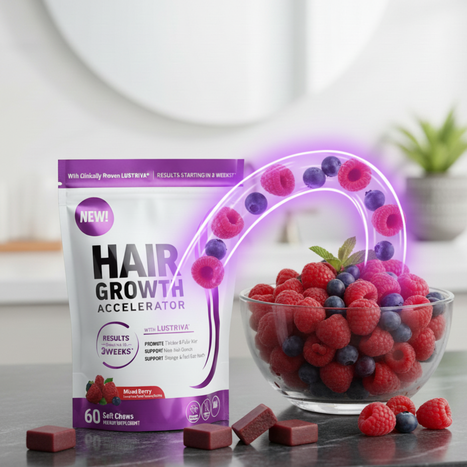 Revitalize your hair from within with these delicious mixed berry soft chews designed to accelerate growth and strengthen every strand.